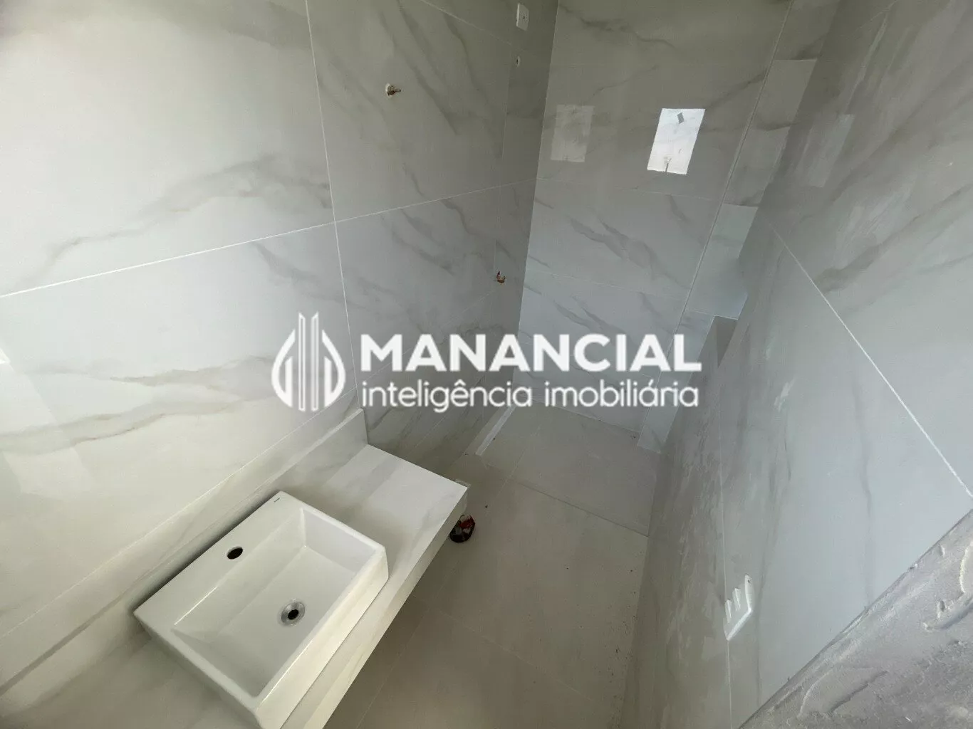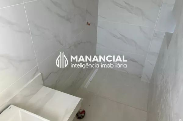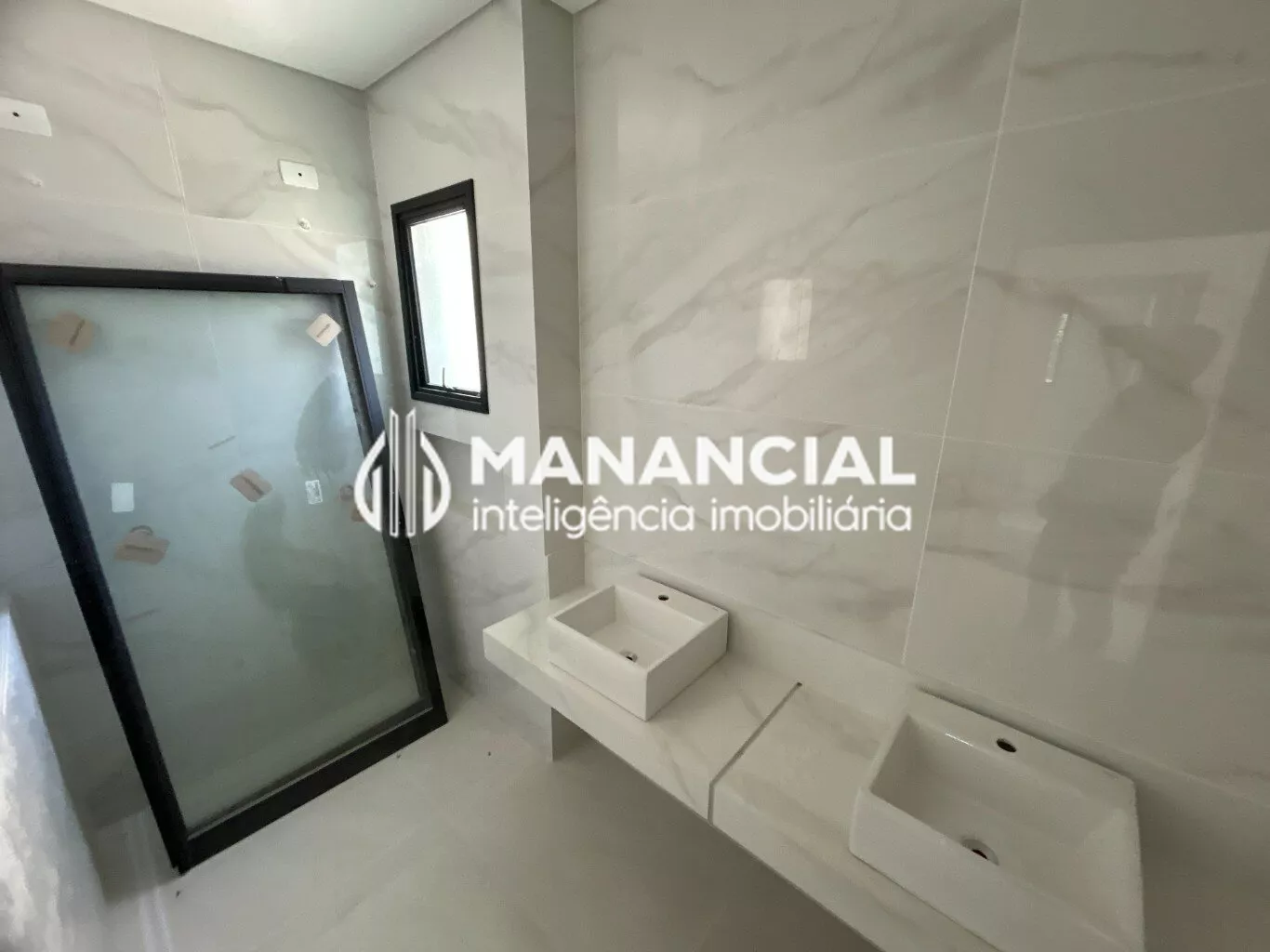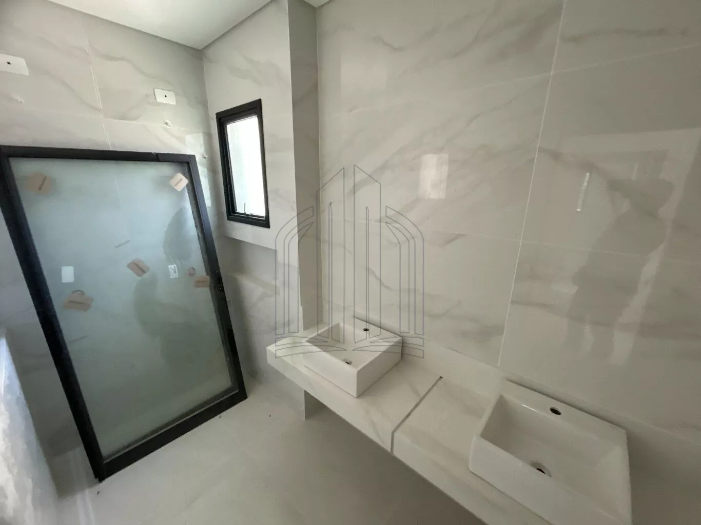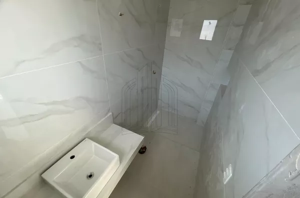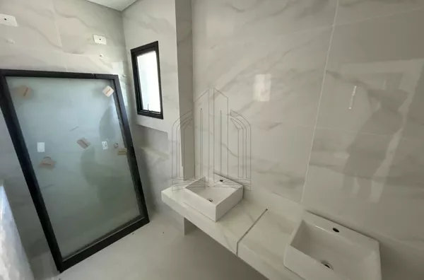 Espelhos nos banheiros, bancada, cuba e torneira monocomando. Box com vidro incolor e metais na cor branca da marca.