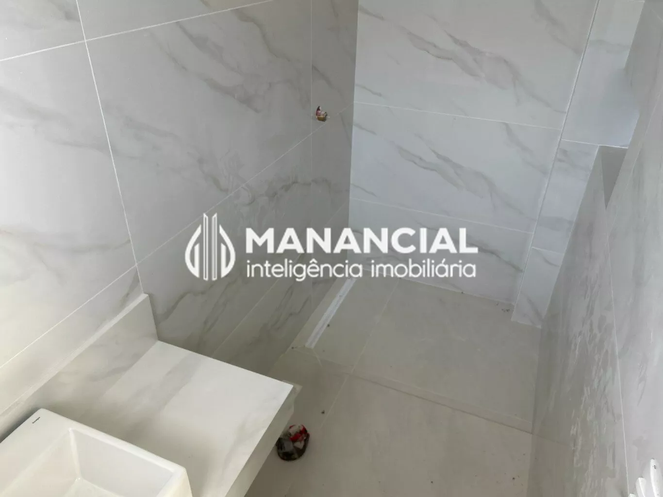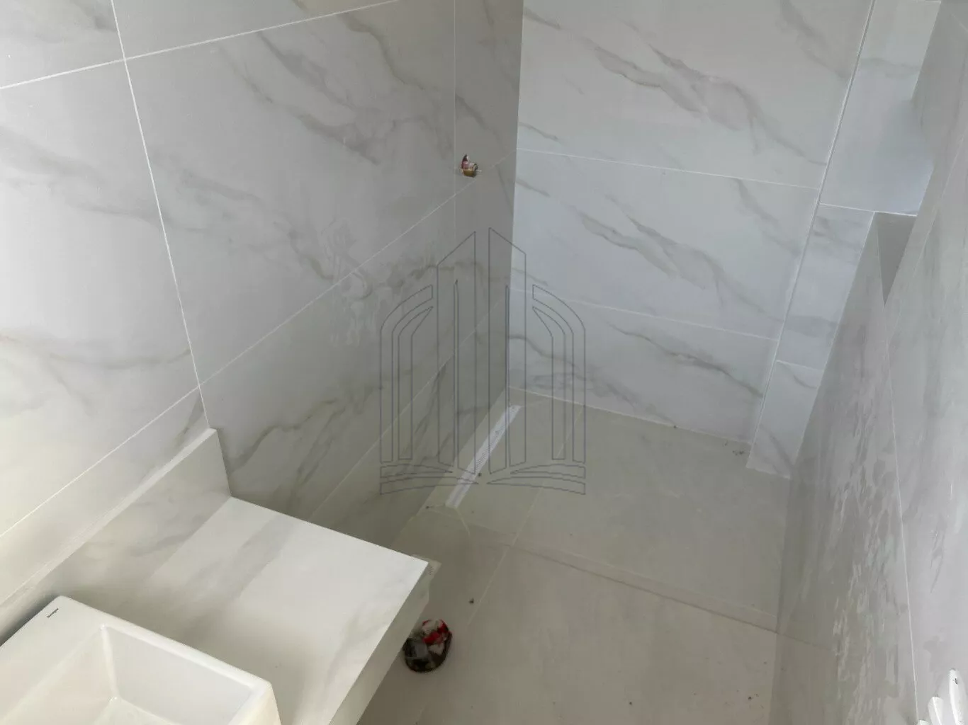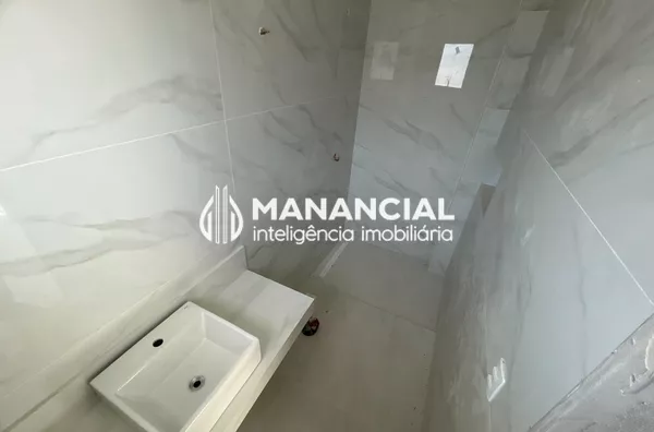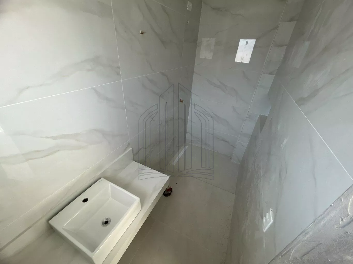 Espelhos nos banheiros, bancada, cuba e torneira monocomando. Box com vidro incolor e metais na cor branca da marca.