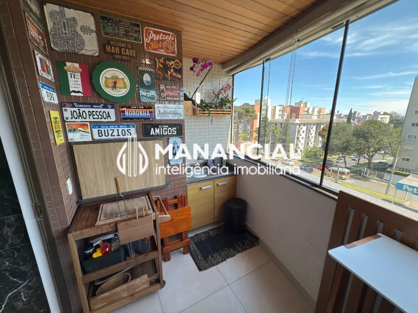 Sacada com churrasqueira a carvão, já fechada em vidro;