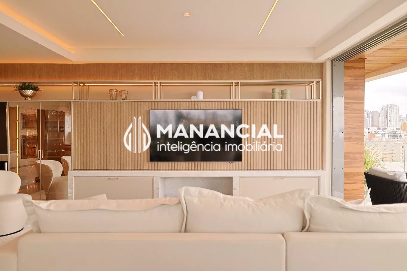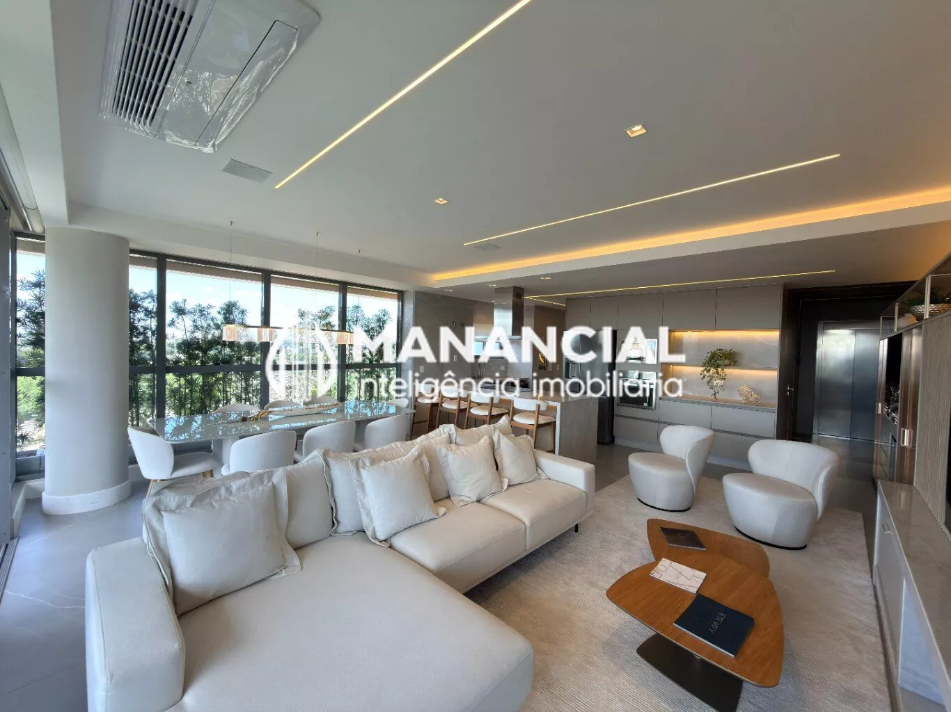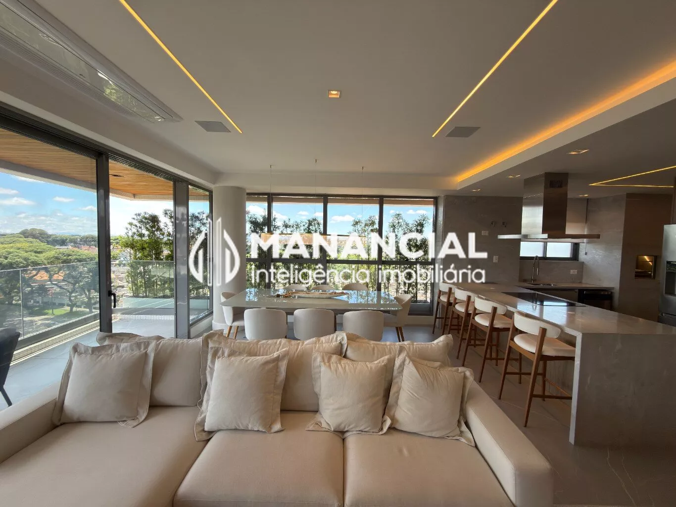 O living apresenta porcelanato de alto padrão, forro de gesso liso com detalhes e cortineiros, além de amplas janelas e esquadrias de alta performance termoacústica, que garantem luminosidade natural e silêncio.